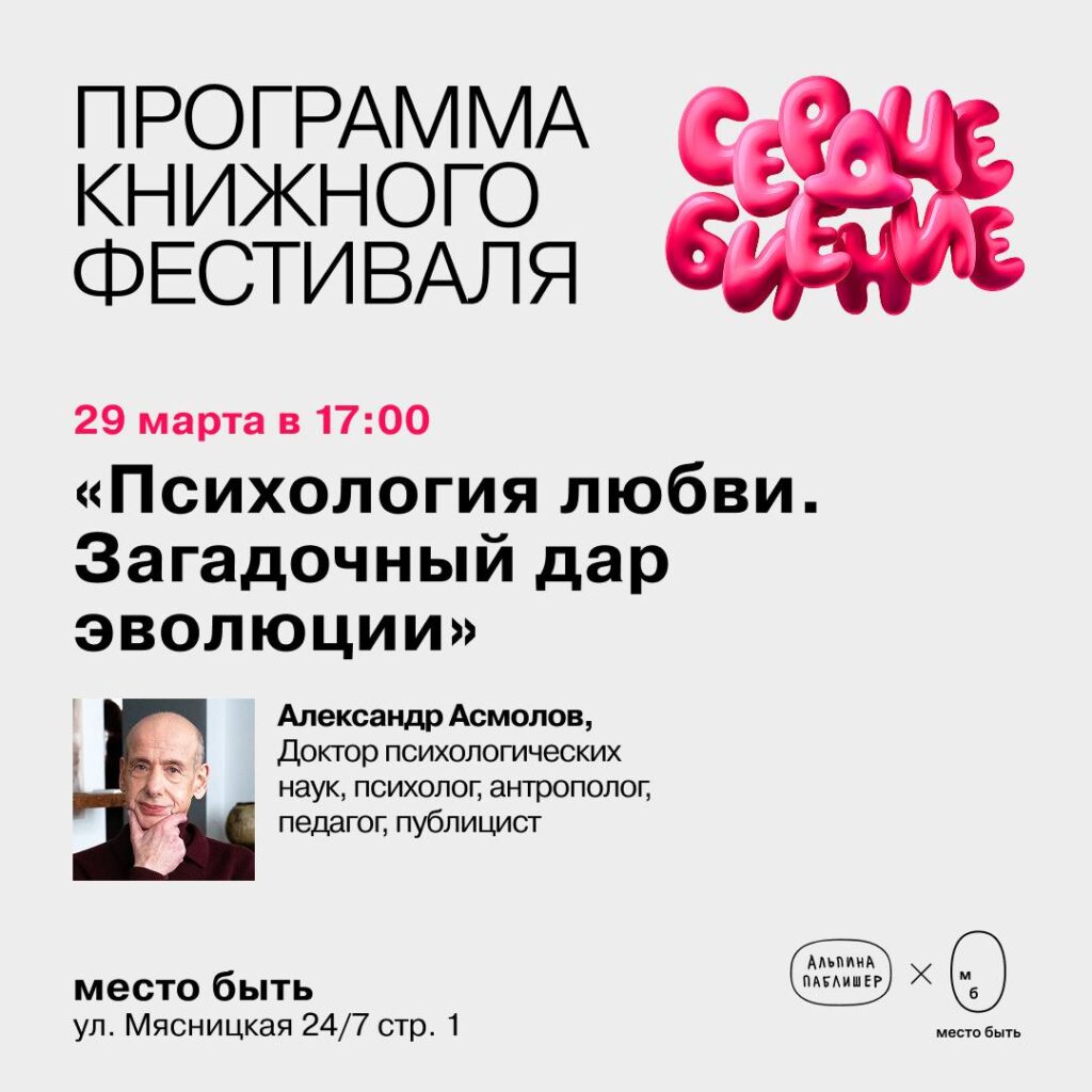 Приглашаем Вас 16 февраля в 19:00 на презентацию новой книги А.Г. Асмолова «Психология любви: Загадочный дар эволюции» Приглашаем вас на презентацию новой книги А.Г. Асмолова «Психология любви: Загадочный дар эволюции». Эта встреча… 06.02.2026·Анонсы